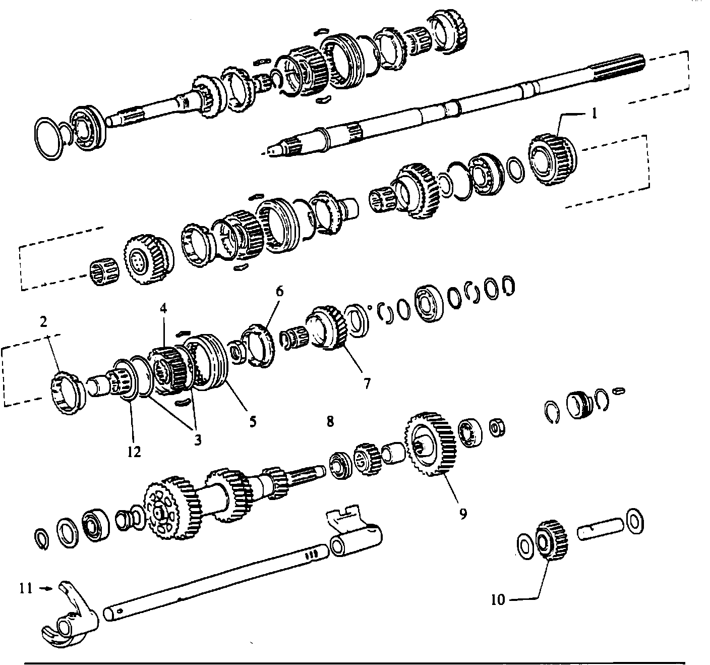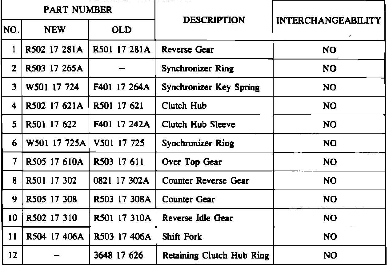 A synchronizer ring has been newly installed on the reverse gear in order to make the shift into reverse smoother. Because of this modification, the parts numbered 1-12 as illustrated below have been modified.