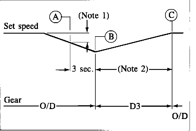 However, the vehicle will continue running in D3 for a specified period (see Note 2) and only then will upshift to O/D. This occurs even if the actual vehicle speed rises back to the original cruising speed originally set. The reason for the delay is in order to prevent frequent up-and-down shifts during long uphill drives.
