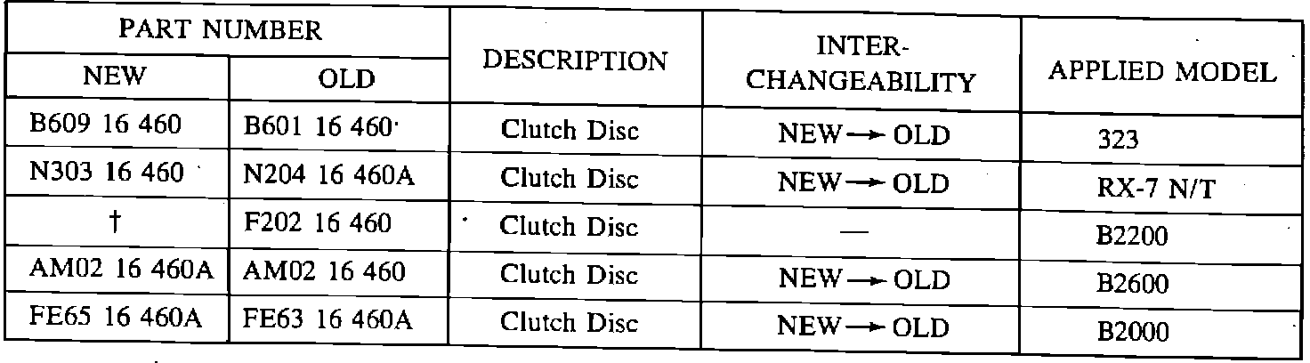 The material of the clutch disc installed on 1987 323, RX-7 (Non-Turbo), B2200 and B2600 at the production line has been changed to reduce the possibility of clutch chatter (judder).