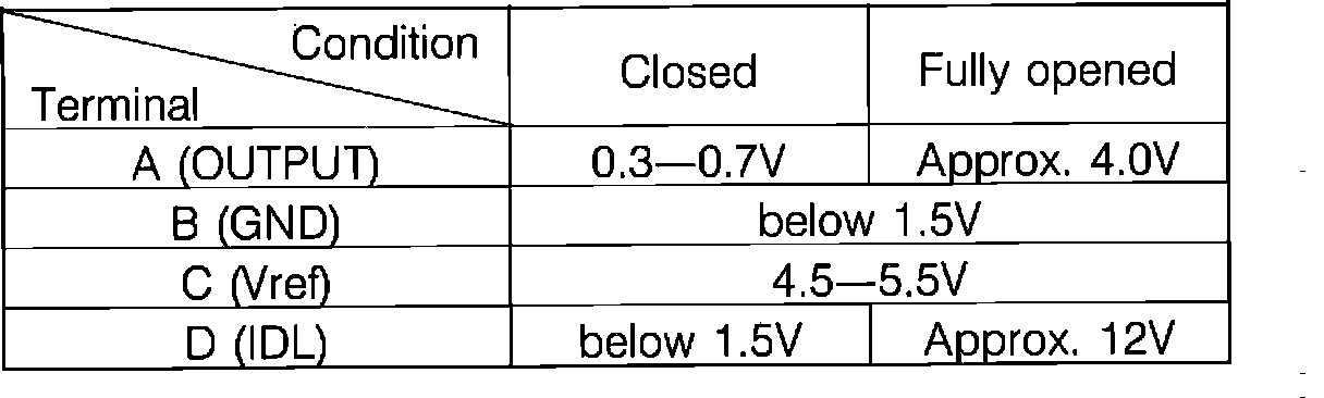 6. If voltage is incorrect at terminals other than D, check resistances of throttle sensor, terminals 2A, 2C, 2E and IG of EGI control unit and the wiring harness.