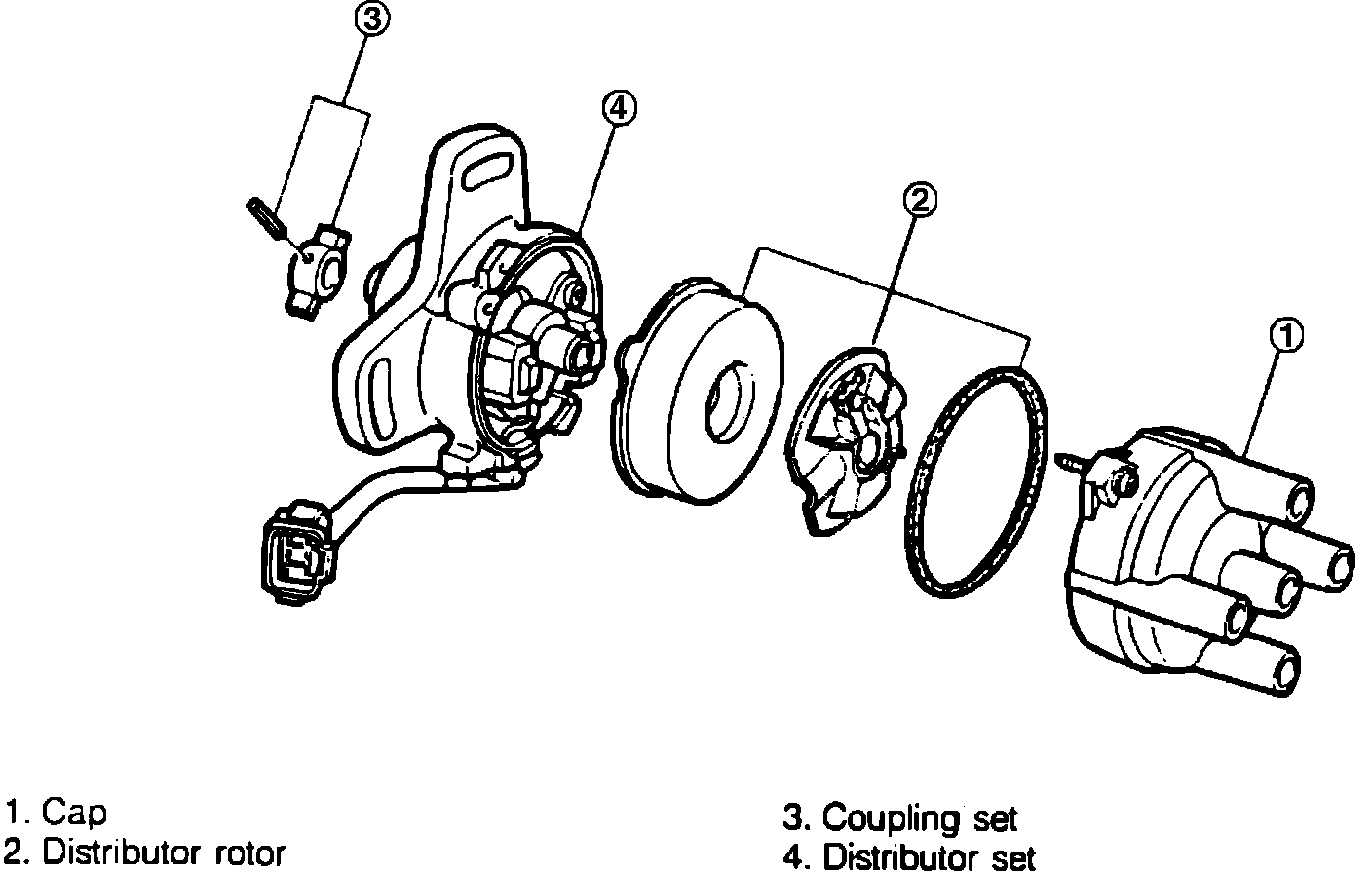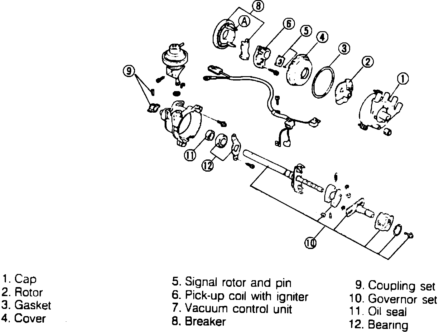 Fig. 7 Disassembled view of breakerless type distributor. Non-turbocharged: