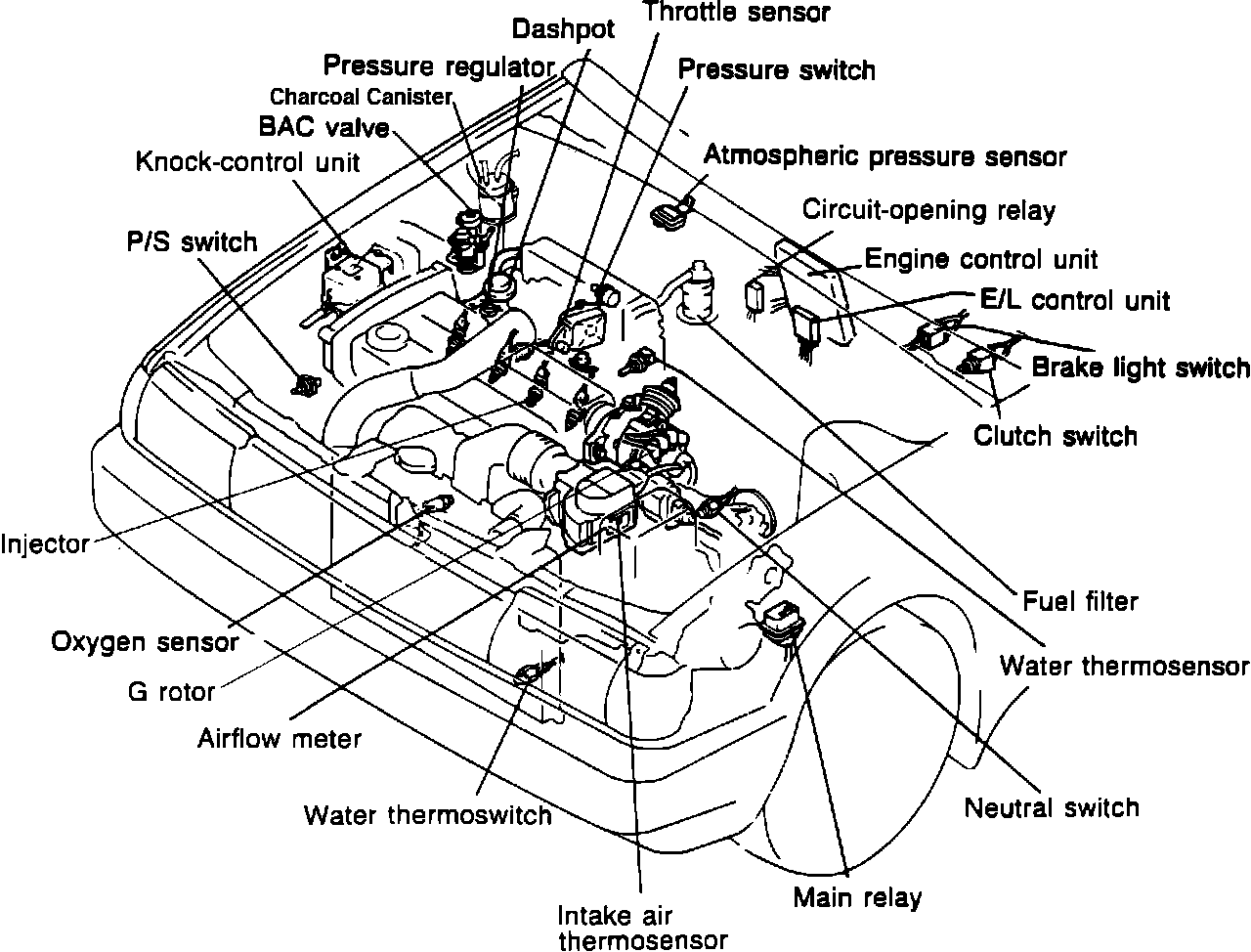 The computerized engine control system is the central control for electronic gasoline injection (EGI), electronic spark advance (ESA), and idle speed control (ISC). The control system does this by monitoring vehicle operating conditions like engine knock, brake light switch position, electrical load, power steering pressure, air conditioning operation, exhaust oxygen content (oxygen sensor), coolant temperature, barometric pressure, intake air temperature, throttle position, intake air volume, and engine speed.