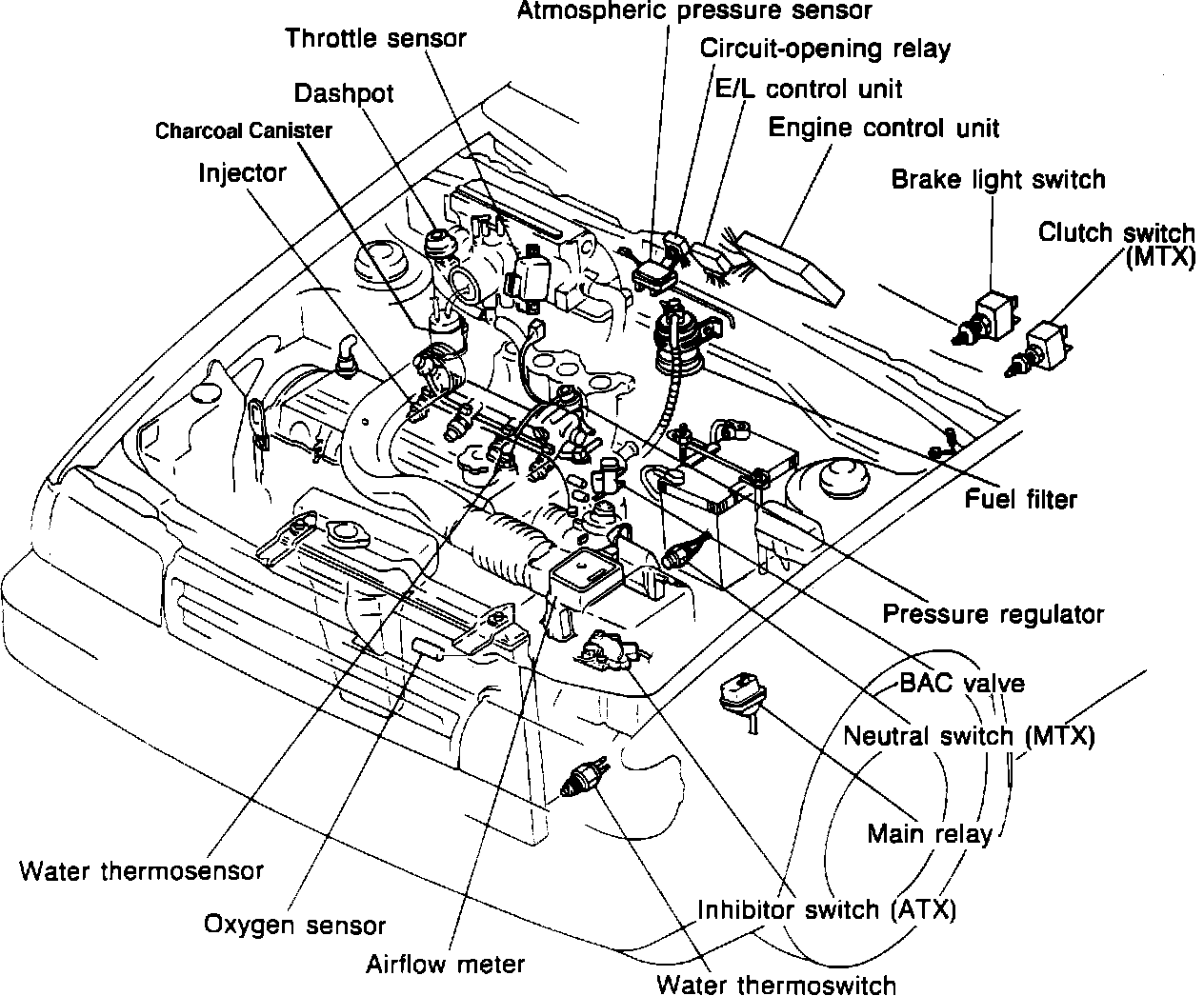 The computerized engine control system is the central control for electronic gasoline injection (EGI), electronic spark advance (ESA), and idle speed control (ISC). The control system does this by monitoring vehicle operating conditions like engine knock, brake light switch position, electrical load, power steering pressure, air conditioning operation, exhaust oxygen content (oxygen sensor), coolant temperature, barometric pressure, intake air temperature, throttle position, intake air volume, and engine speed.