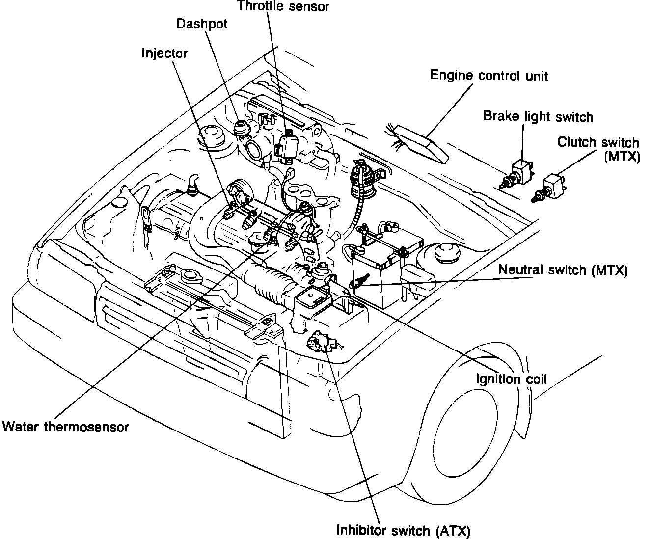 The ECU receives inputs from the sensors and cuts the fuel injection signal to the injectors. The water thermosensor detects the engine coolant temperature and sends a signal to the ECU. The inhibitor switch (ATX only) detects in-gear conditions and sends a signal to the Electronically Controlled Automatic Transmission (EC-AT) control unit. The switch is on when the transmission selector is in the "neutral" or "park" position. The brake light switch detects braking operation (deceleration) and sends a signal to the engine control unit. The neutral and clutch switches detect when the vehicle is in gear and the clutch is engaged. These switches send signals to the ECU.