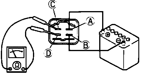 3. Check for continuity at the terminals with an ohmmeter. With 12 volts applied to the terminals, there should be continuity between terminals "C" and "D" of the main relay. With the voltage removed, there should be no continuity between terminals "C" and "D" of the main relay.