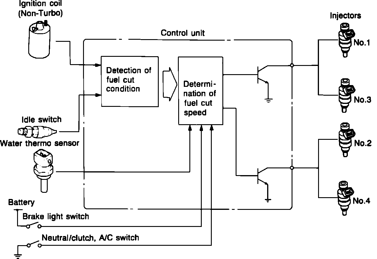 The deceleration control system cuts fuel delivery under certain conditions. The components of the deceleration system that are computerized engine control system related are the engine control unit (ECU), idle switch, water thermosensor, brake light switch, and neutral/clutch switch (MTX only).