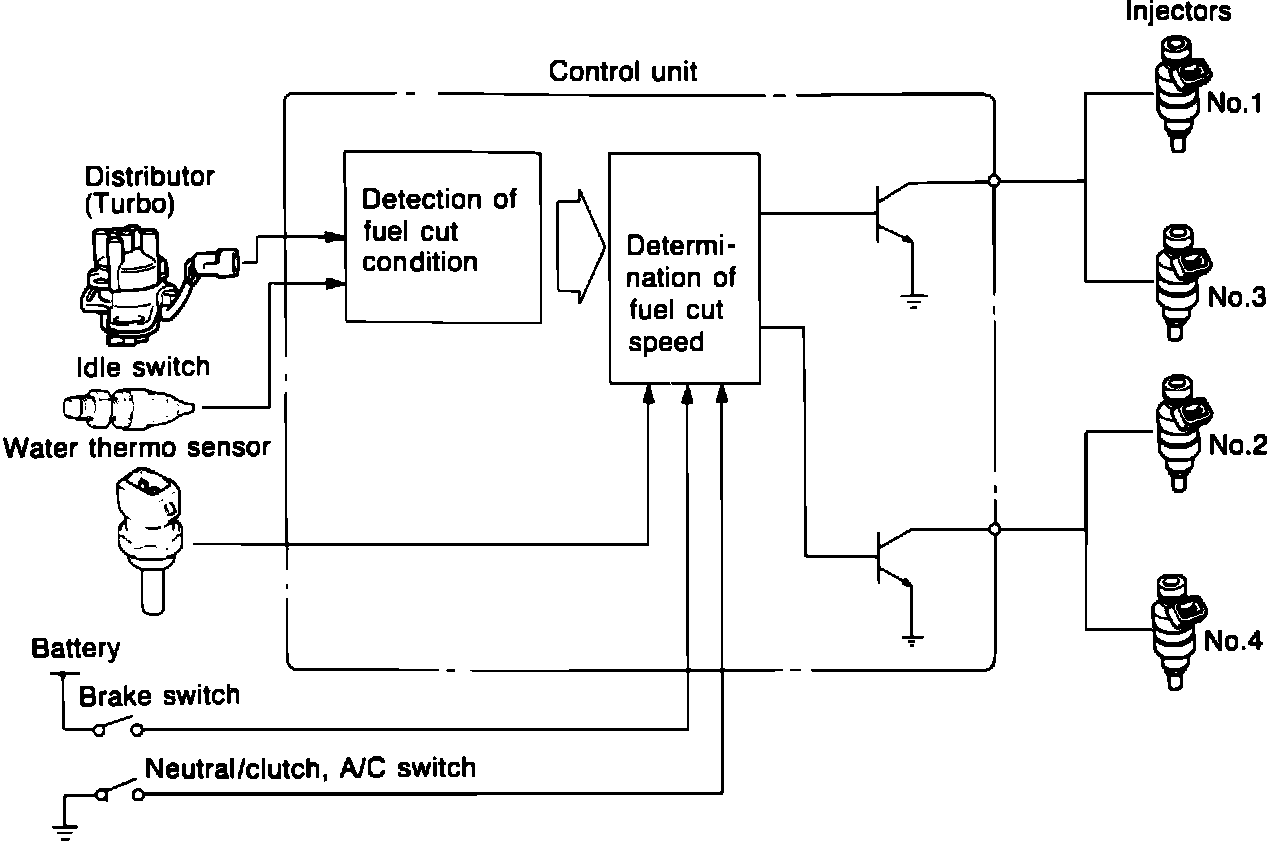 The deceleration control system cuts fuel delivery under certain conditions. The components of the deceleration system that are computerized engine control system related are the engine control unit (ECU), idle switch, water thermosensor, brake light switch, and neutral/clutch switch (MTX only).