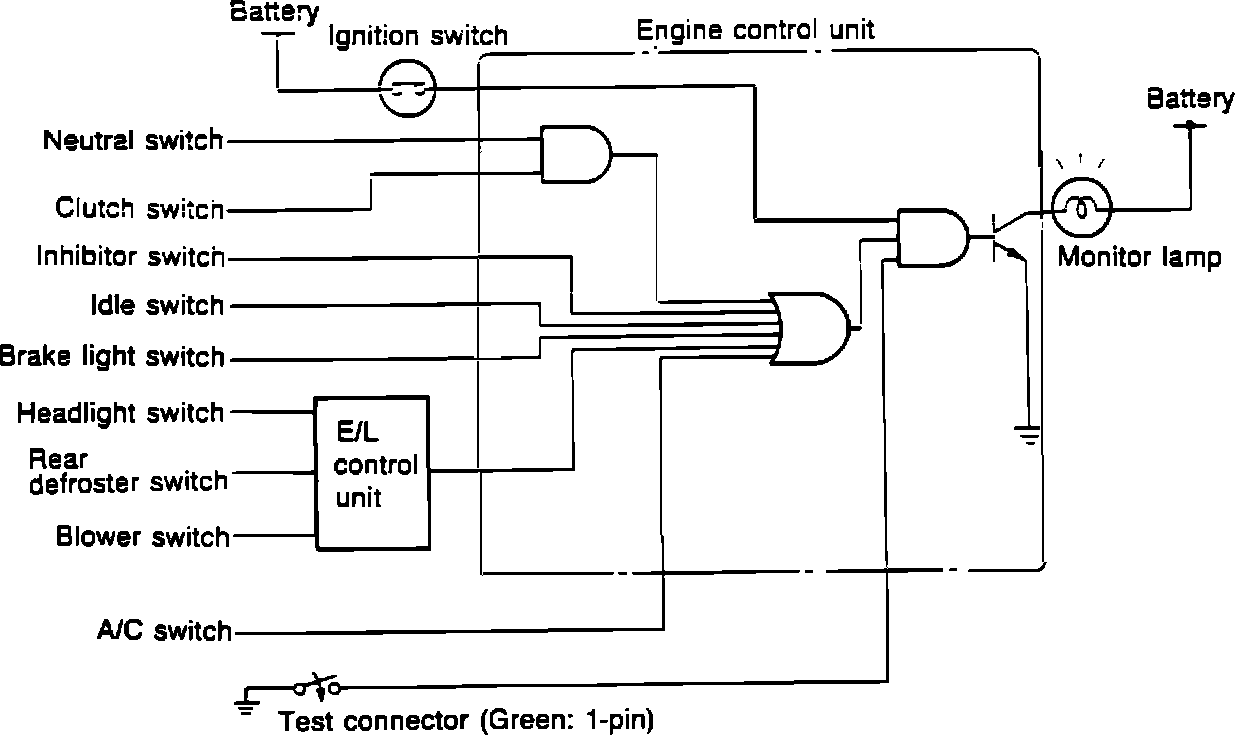2. Connect the self diagnostic tester (SST Mazda Part# 49 H018 9A1) to the check connector (Green:6-pin) and the negative battery terminal.