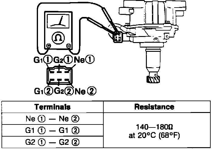 In the electronic engine control system utilized on this vehicle, two signals generated by the distributor crank angle sensor are used by the ECU in its calculations for various outputs. When problems with these signals are detected, malfunction codes are set and can be retrieved from the on-board diagnostic system.A faulty "Ne" signal will set malfunction code 02. A problem with the "G1" signal will set malfunction code 03. "G2" will set malfunction code 04. Refer to ON-BOARD DIAGNOSTICS under COMPUTERIZED ENGINE CONTROLS.