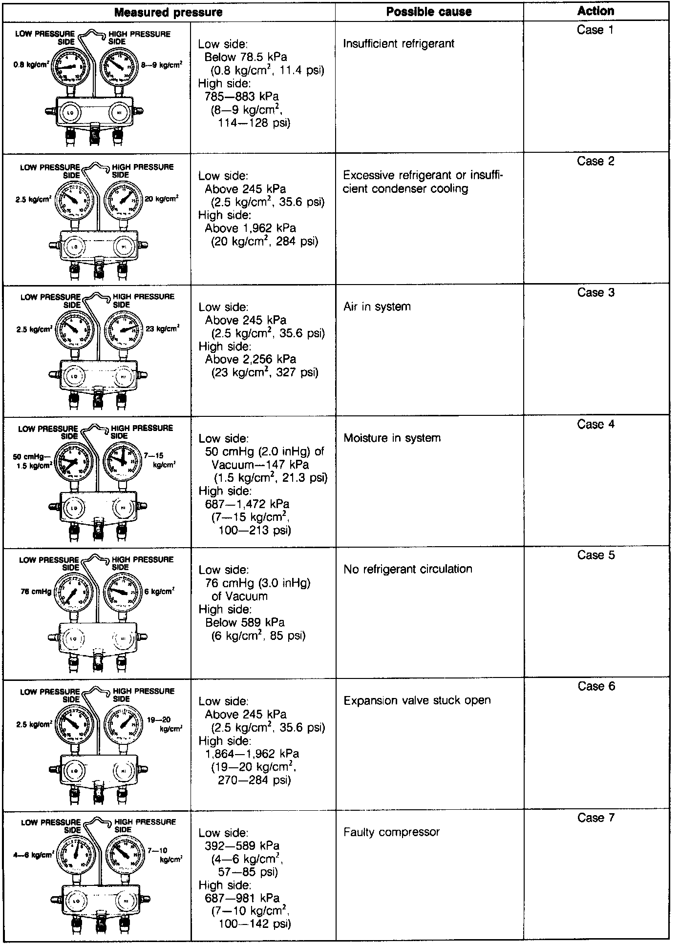 High-pressure side: 687-981 kPa (7-10 kg/cm2, 100-142 psi)