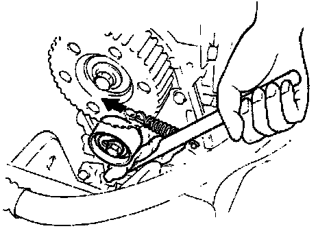c. Install the timing belt tensioner and spring. Temporarily secure it with the spring fully extended.