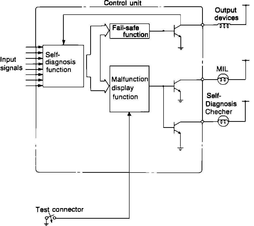 NOTE: The ECU constantly checks for input device malfunctions. However, it only checks for output device malfunctions in a 3 second period after the ignition switch is turned "ON" with test connector grounded.
