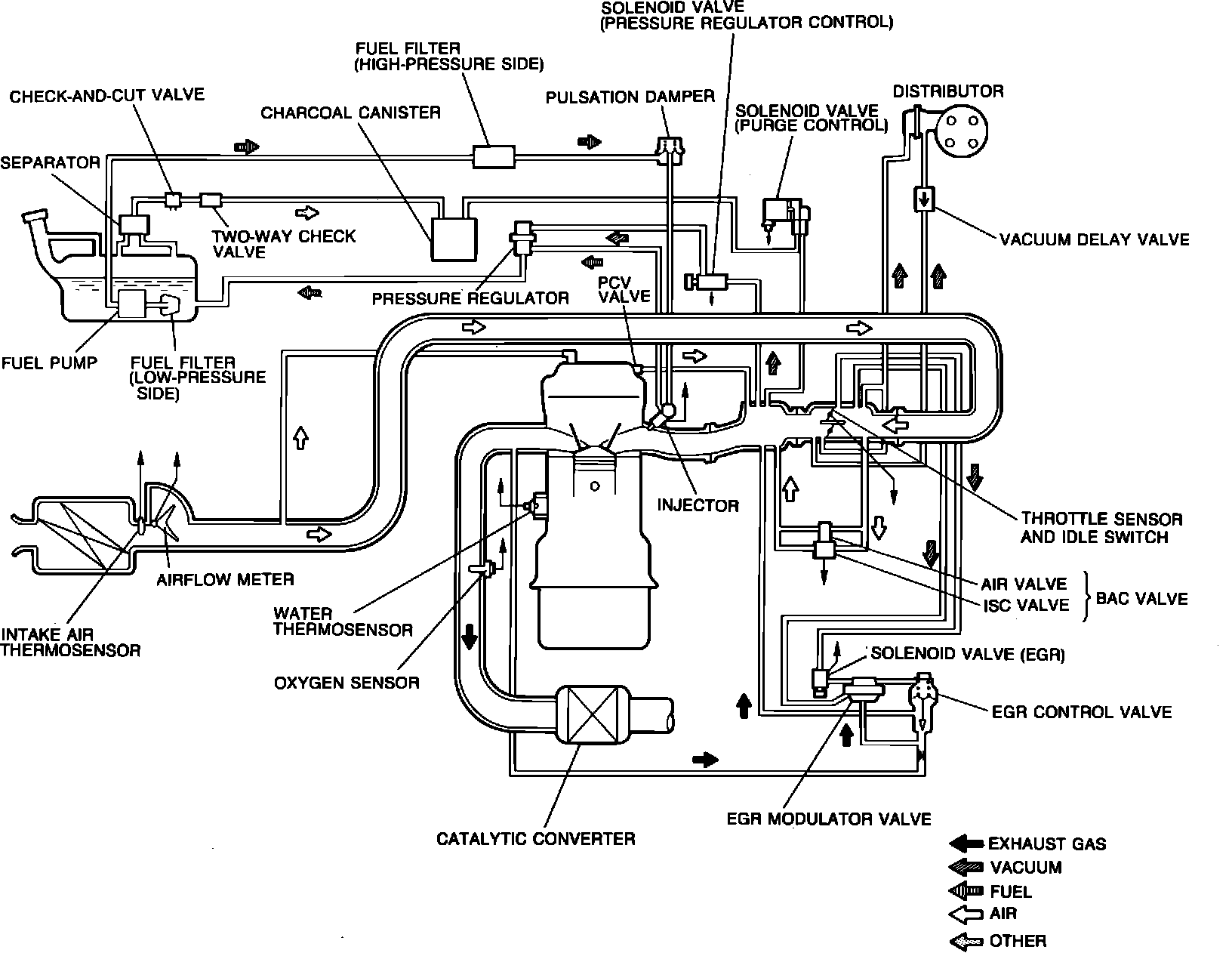 This vehicle is equipped with a 2.2 liter, 4 cylinder, SOHC (single overhead camshaft) gasoline engine, and a computer controlled electronic fuel injection system (referred to as EGI - electronic gasoline injection). The system maintains an air/fuel mixture as close as possible to the ideal stoichiometric ratio, for all operating conditions. Fuel is supplied to the injectors at high pressure, by an electric fuel pump in the tank. The computer monitors various sensors mounted on the engine, including an exhaust gas oxygen sensor, then uses this information to determine the amount of fuel needed. The computer energizes the injectors (either all at once or in pairs) for varying lengths of time, depending on the amount of fuel required.