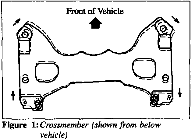 When the vehicle pulls to the right side, move the right side of the crossmember forward to increase the right caster angle. At the same time, move the left side of the crossmember backward to decrease the left caster angle. Figure 1.