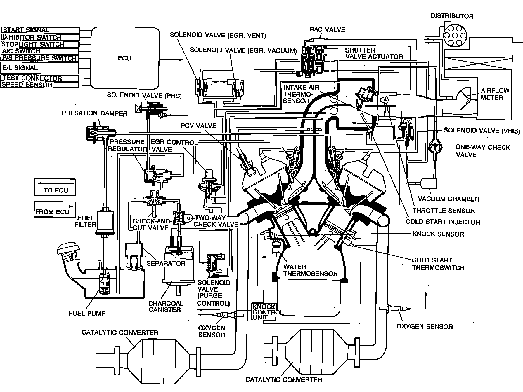 The Feedback System monitors air/fuel ratio by means of the voltage signal from both left and right oxygen sensors. The ECU will set a different trouble code for defects detected on each side. Various problems in addition to a defective oxygen sensor can cause the ECU to detect a malfunction in this system and set a trouble code. Some of these problems include: