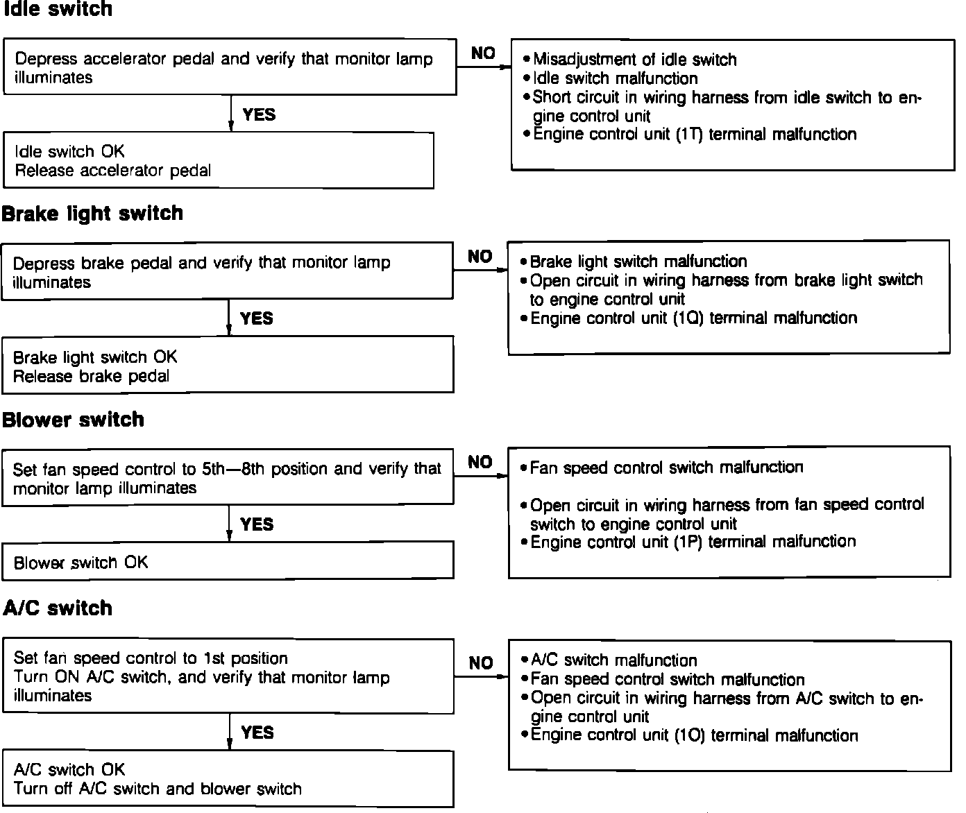 4. Turn ignition switch "ON." Check that monitor lamp illuminates when each switch is made to function according to procedure on image chart.