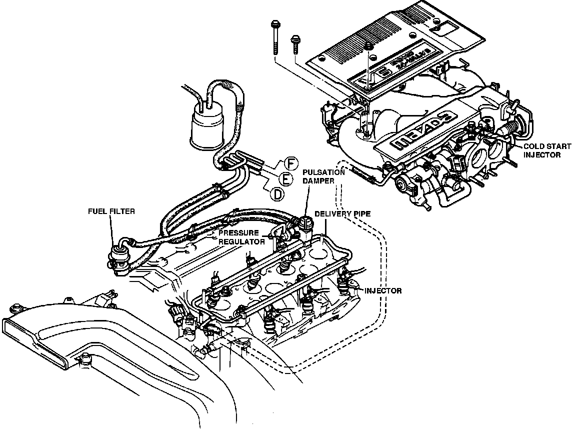 The fuel rail is a reservoir that supplies fuel at equal pressure to all the injectors. Its volume is larger than that of a fuel hose or tube so that when one injector opens, it doesn't cause a pressure drop in the fuel supplied to the other injectors. Injectors are installed in the intake manifold and held in place by the fuel rail. The fuel pressure regulator and pulsation damper are mounted on a machined block that is part of the fuel rail.
