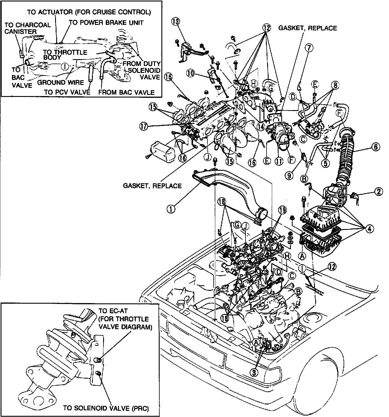 16. Intake air thermosensor connector, vacuum hoses, and ground connectors