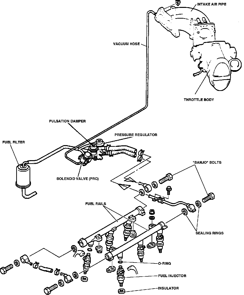 The injectors are constructed of stainless steel and high density plastic, to resist corrosion. They consist of a fuel inlet with filter screen, an electrical solenoid and connector, and a pintle valve and nozzle. Injectors are held in place by the fuel rail and sealed by an O-ring and insulator.