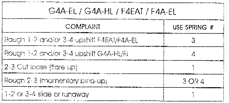 There is a limit as to what servo return spring calibrations can accomplish. However, considering the difficulty and time involved to R & R the valve body (especially G4A-EL and G4A-HL) it can be very cost effective to at least try a different spring.