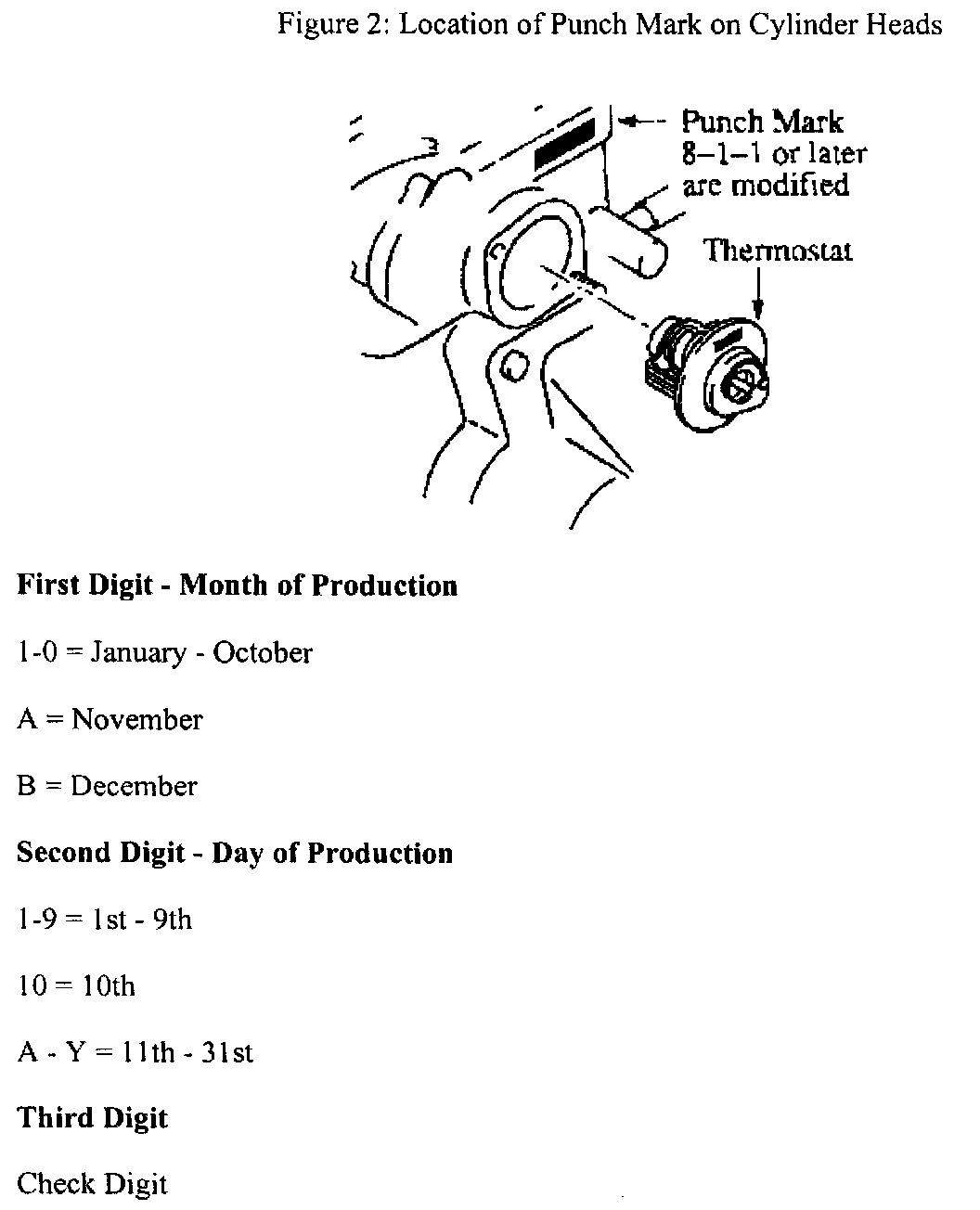1. Check the punch mark numbers on the cylinder head to determine production date. If the numbers read 8-1-1 or later, the cylinder head was manufactured using a modified machining process and does not require further inspection. Figure 2.