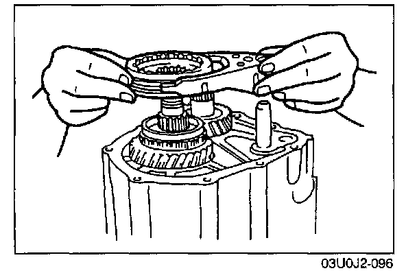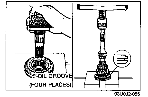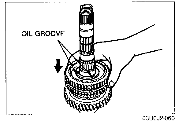 - Align the synchronizer ring groove and clutch housing hub key when installing.