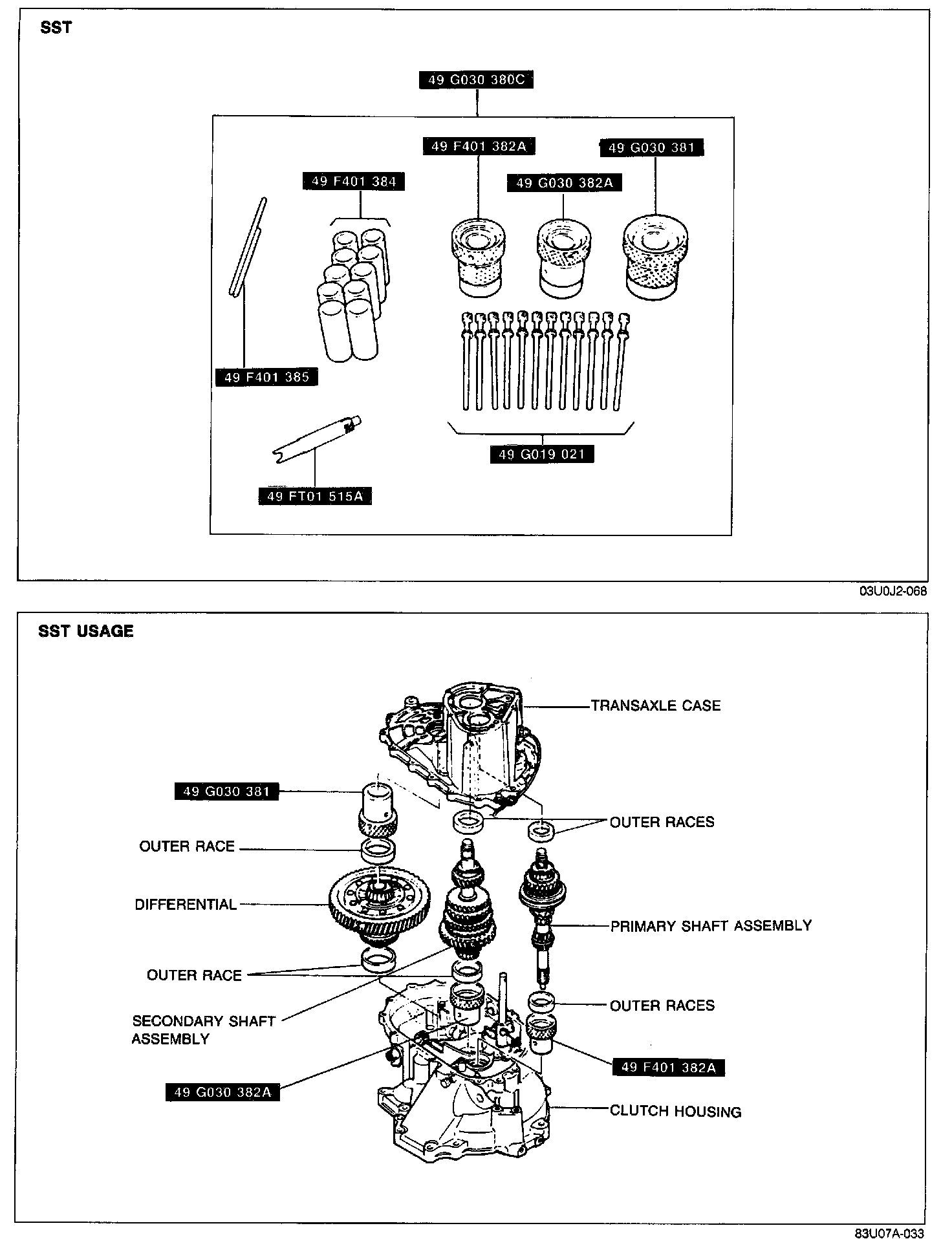 1. Install the primary and secondary shaft bearing outer races into the transaxle case (diaphragm springs and shims removed).