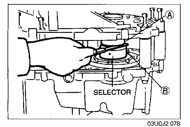 7. To seat the bearings, mount the SST (bars) on parts (A) and (B) of the selector, and turn the selector so the gaps are widened.