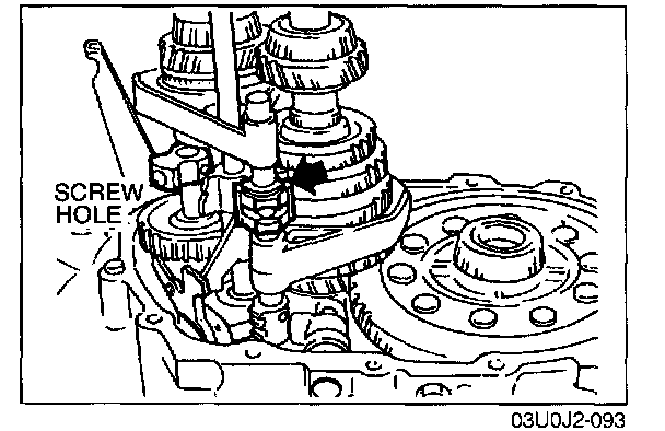 3. Align the end of the interlock sleeve with the control lever (indicated by the arrow), and, at the same time, face the reverse idler shaft screw hole in the direction shown in the image.