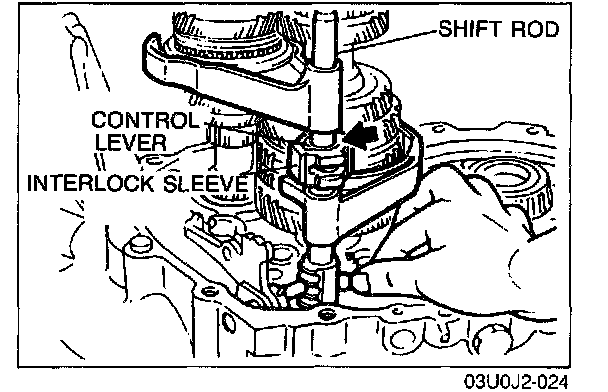 1. Align the ends of the interlock sleeve and of the control lever (arrow). Turn the shift rod counterclockwise.