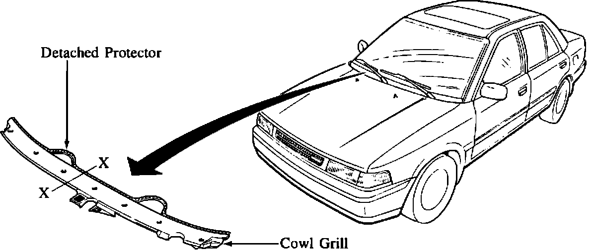 Through routine inspection, some vehicles have been found to have the cowl grill protector unfastened as in the illustration below.