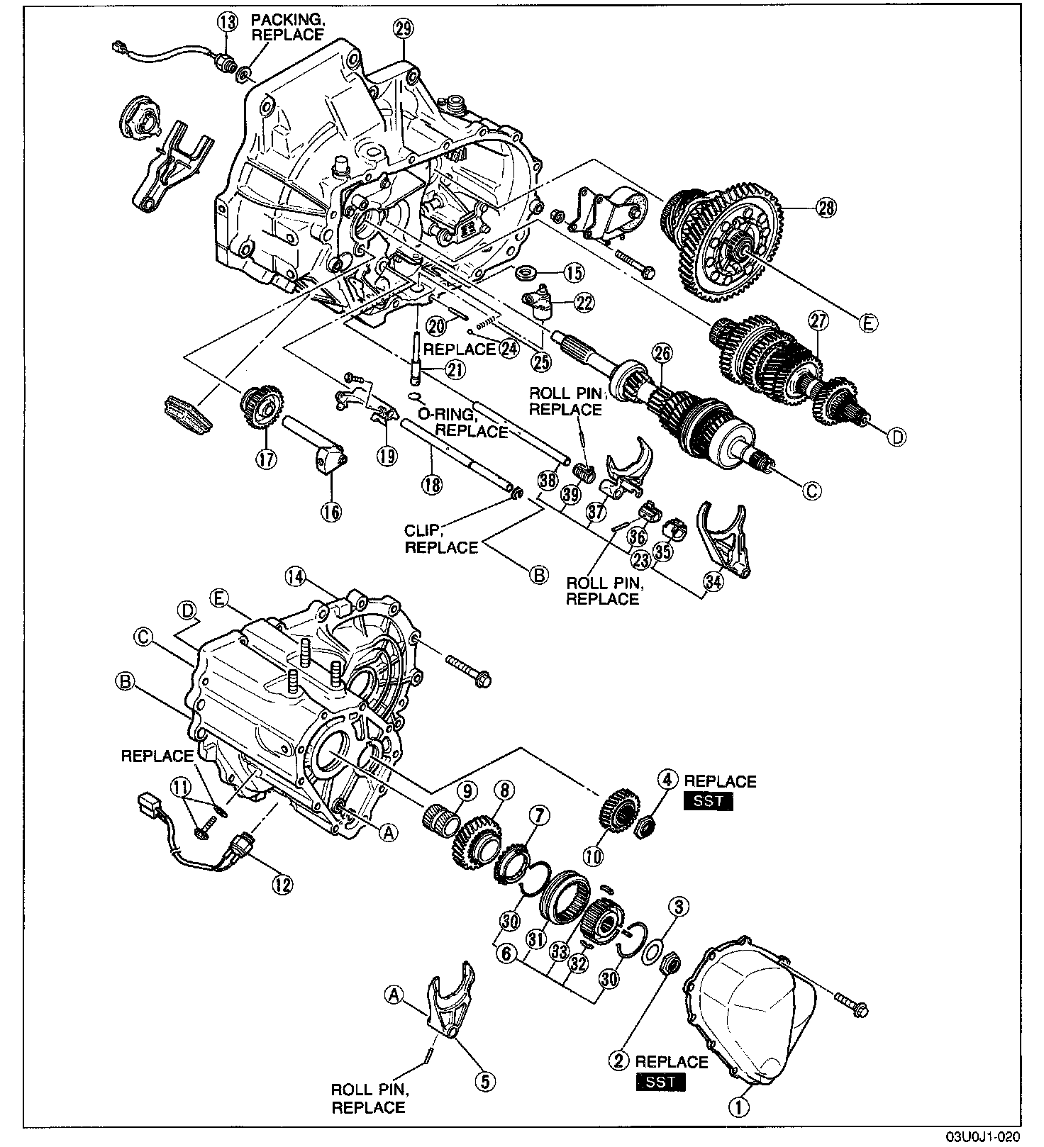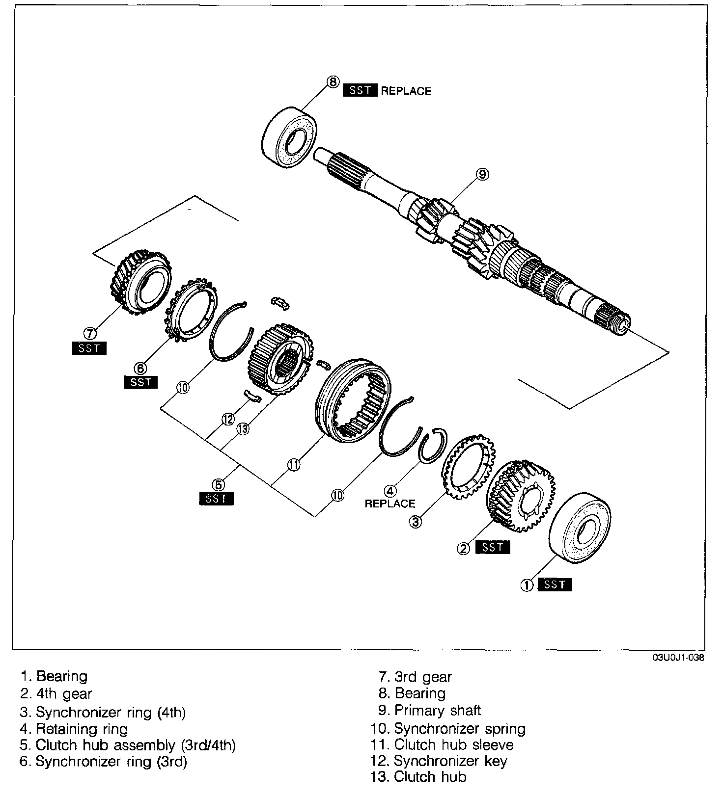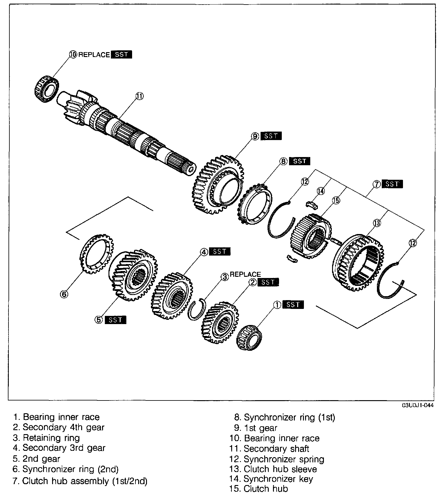 1. Remove the clutch hub assembly (1st/2nd), synchronizer ring (1st) and 1st gear with the SST.
