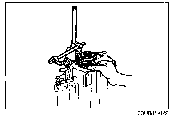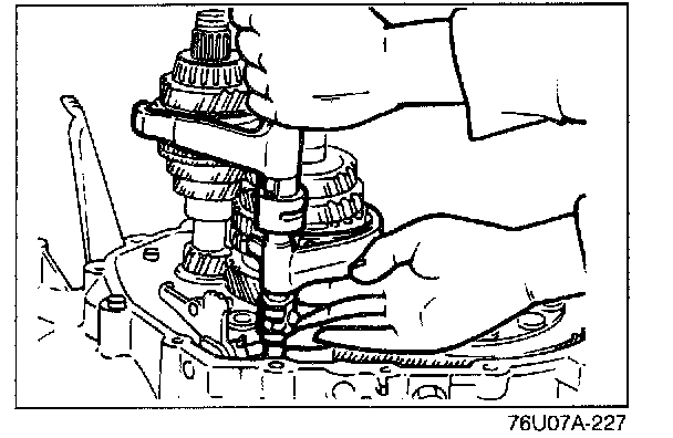 2. While holding the 1st-2nd shift fork with one hand and the 3rd-4th shift fork with the other, raise them both at the same time and shift each of the clutch hub sleeves.