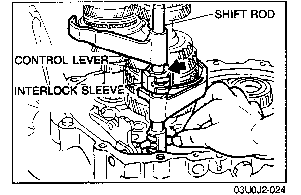 1. Align the ends of the interlock sleeve and of the control lever (arrow). Turn the shift rod counterclockwise.