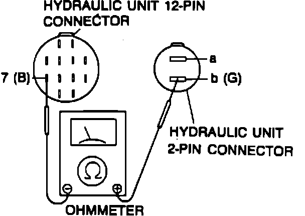 1. Disconnect hydraulic unit 12 pin connector, then check for continuity between terminal 7(B) and ground, Fig. 50.