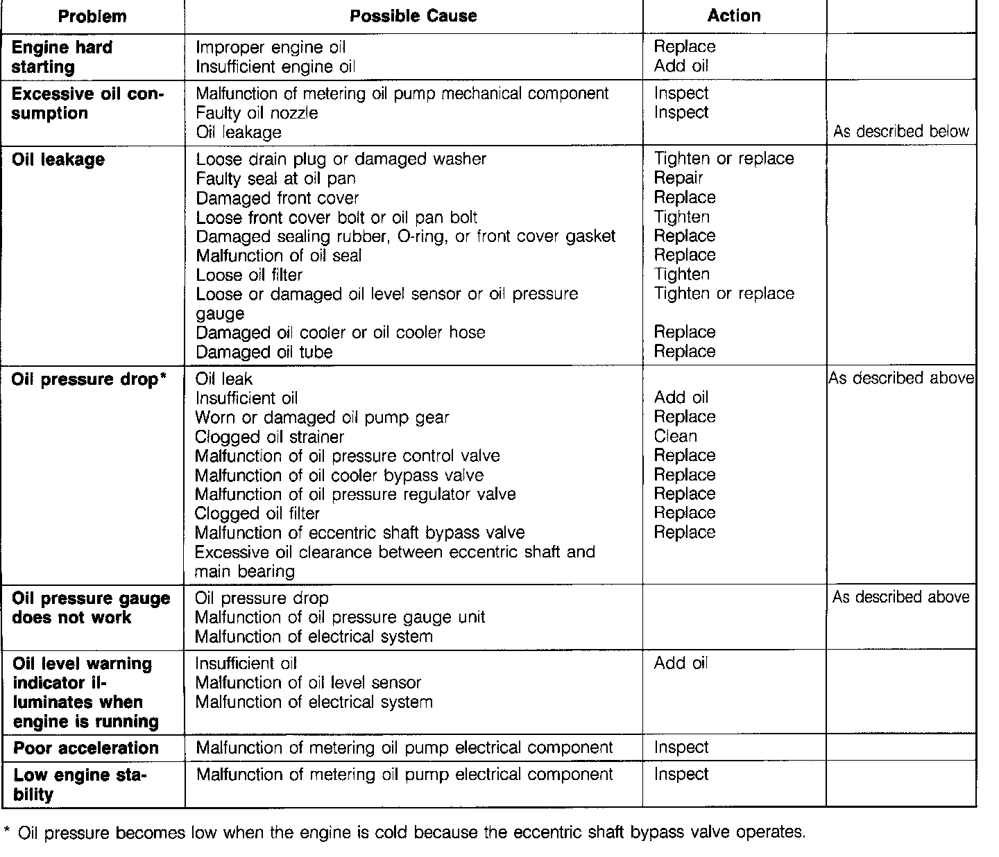 Excessive oil consumption is caused by metering oil pump malfunction. Before replacing the metering oil pump, first perform the oil leakage inspection in Troubleshooting guide and electrical component inspection.