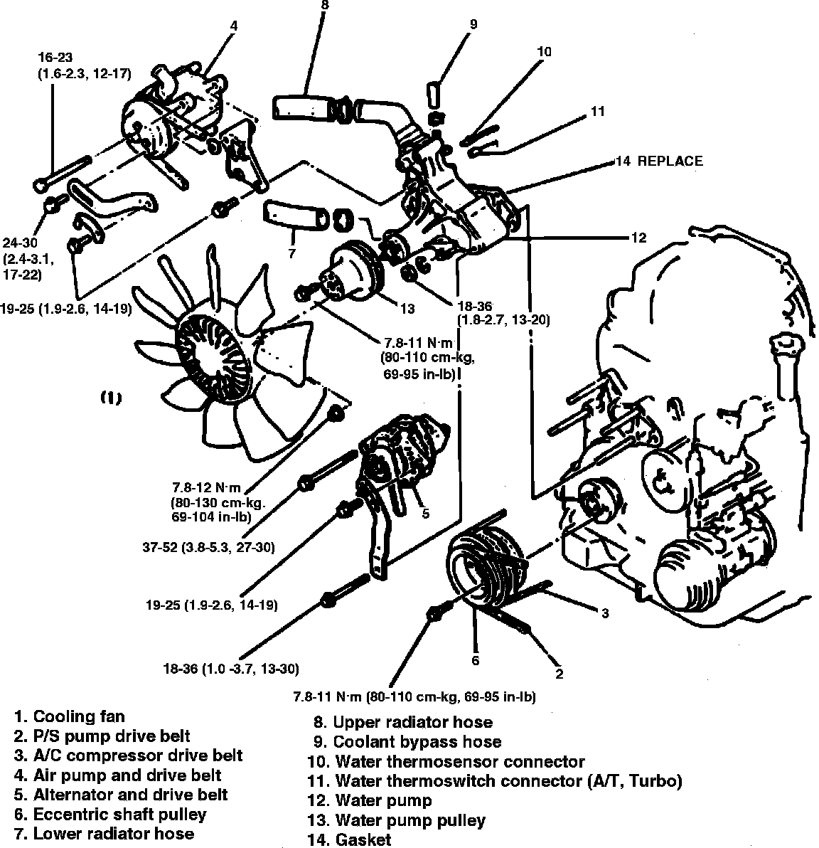 5. Remove eccentric shaft pulley, then disconnect upper and lower radiator hoses and the coolant bypass hose.