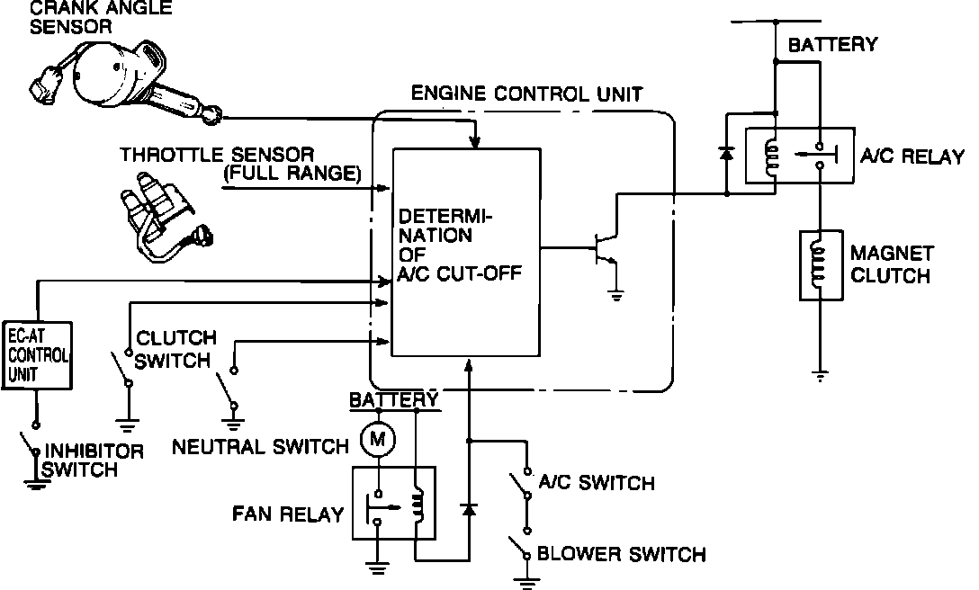 In order to maintain acceleration performance with the air conditioning system in operation, the ECU will initiate A/C cut-off under certain conditions by de-energizing the A/C clutch relay.
