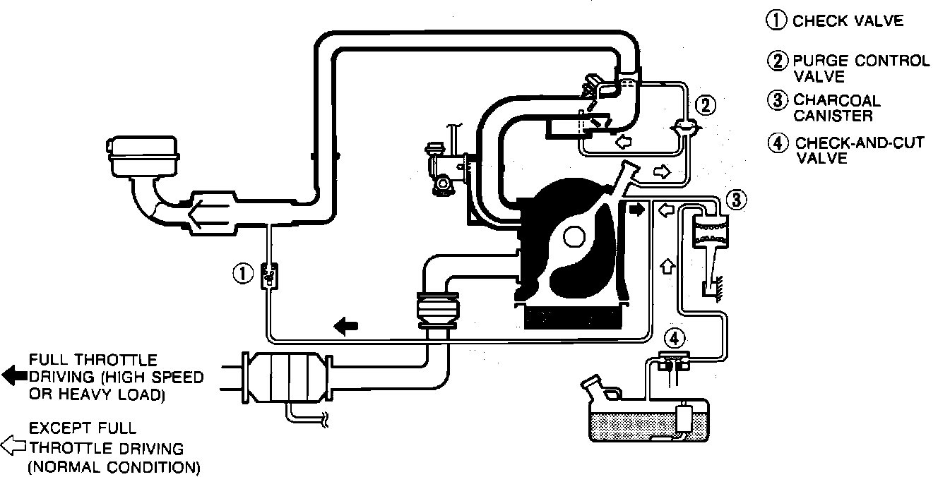 The evaporative emission control system uses a charcoal cannister to store the vapors generated by the fuel in the fuel tank. The fuel vapor is stored in the cannister until it is drawn into the combustion chamber and burned when the engine is running.
