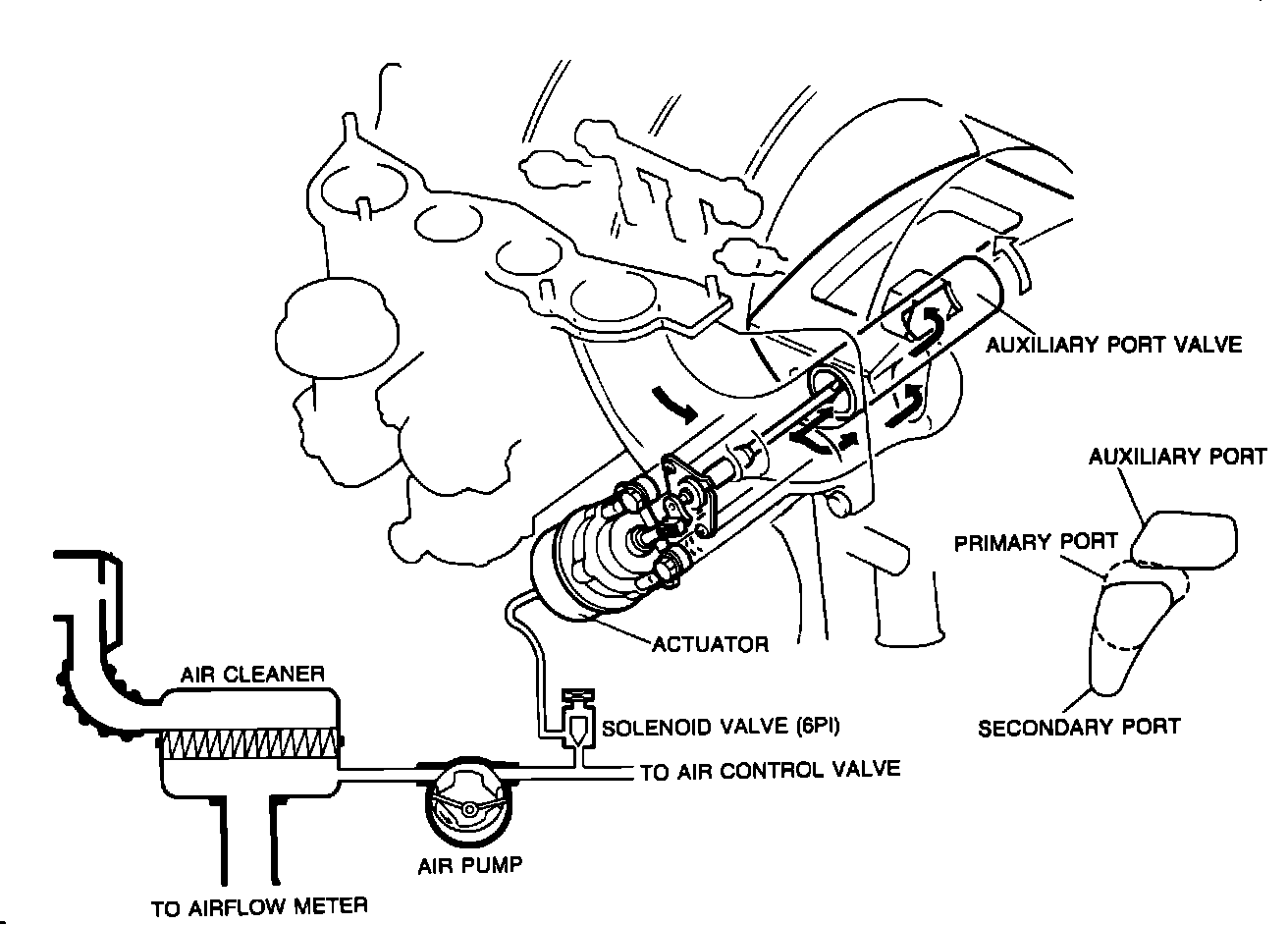 At engine speeds below 3850 rpm, the solenoid valve is not activated and the auxiliary port valve is open to the auxiliary port. As engine speed increases beyond 3850 rpm, the ECU energizes the solenoid valve to direct air pump air pressure to the actuator. With varying air pressure according to engine speed, the actuator rotates the auxiliary port valve to open the primary and secondary ports as required for different rpm ranges.