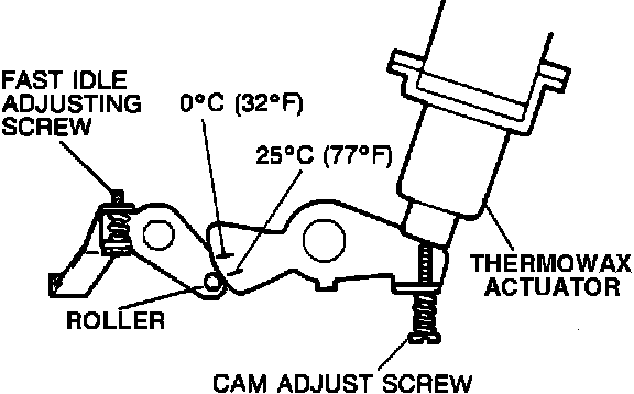 4. Check that thermowax actuator extends fully and fast idle cam no longer touches roller on throttle lever.