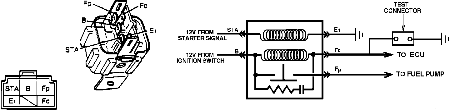 If 12 volts is present at terminal "Fc" during engine cranking or engine running, and the engine dies after starting, check for open in wiring between that terminal and the engine control unit. If wiring is OK, check ECU connectors for good connections and check ECU grounds. If no wiring problems are found, faulty ECU fuel pump relay ground circuit is indicated.
