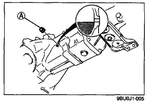 2. Verify that the oil is at the bottom of the check plug hole. If it is low, add the specified oil from check plug (A).