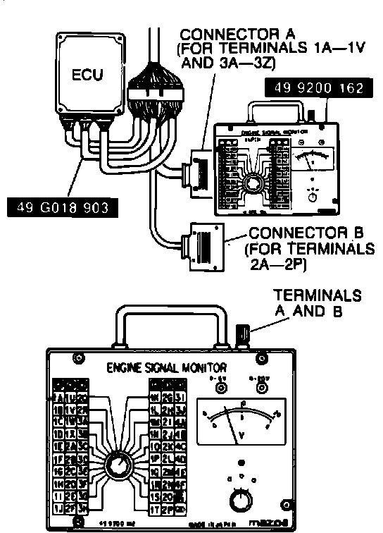 The Mazda Engine Signal Monitor (#49 9200 162) is utilized to check ECU terminal voltages. This tool inspects individual terminal voltages as selected with the monitor switch. A high impedance volt/ohm meter can also be used to check these voltages. Aftermarket test units are available that will read ECU terminal voltages when connected with proper adapters.