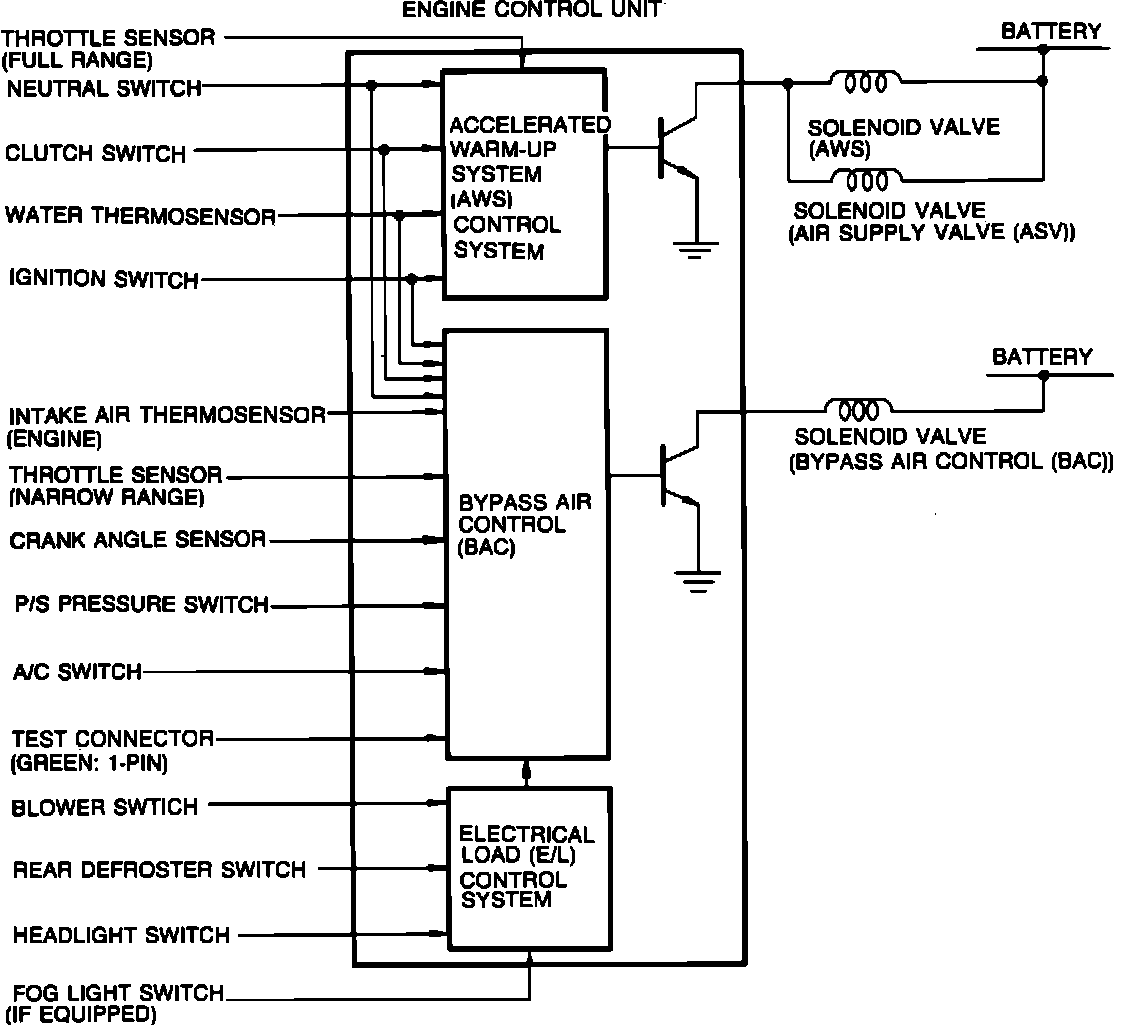 The Accelerated Warm-Up System (AWS) and Air Supply Valve (ASV) Solenoid Valves, both located on the intake manifold, act in conjunction to ensure good driveability and low emissions immediately after engine start under specified conditions. These are components of the idle speed control (ISC) system.