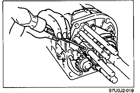 Install the shift rod ends onto the proper shift rods, and secure them with new roll pins.