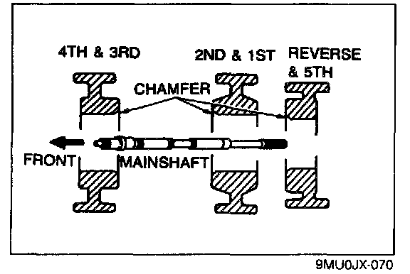d. Install the clutch hubs with the chamfers of the inner gear teeth as shown.