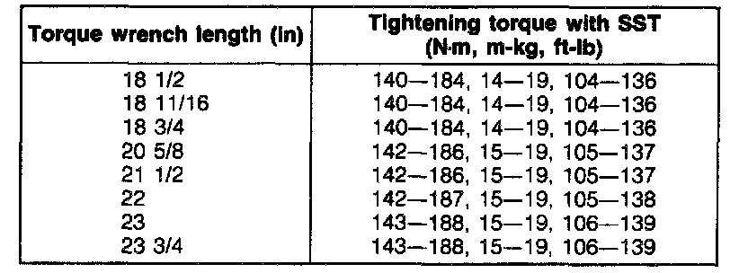 Tightening torque (without SST): 157 - 206 N-m (16 - 21 m-kg, 116 - 152 ft-lb)