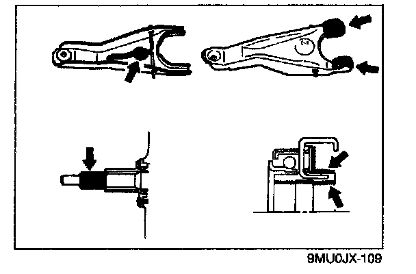 1. Apply More white TA No.2 or equivalent organic molybdenum grease to the shaded areas of the release bearing and release fork.