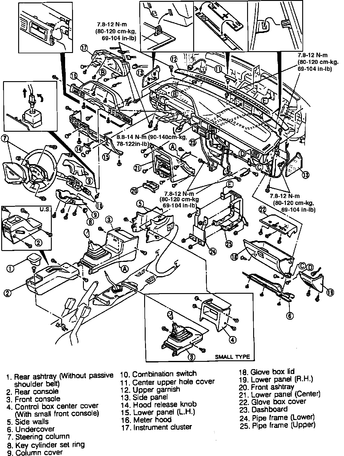 Disconnect battery ground cable and remove instrument panel components in order shown in